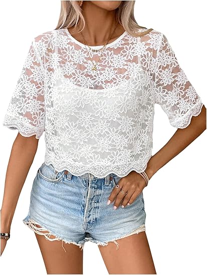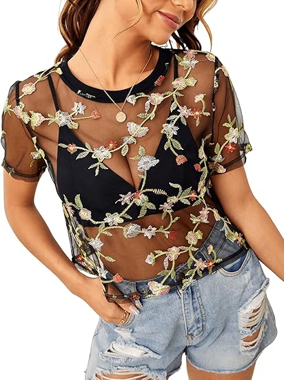 Women Sexy Sheer Mesh Crop Tops Floral Embroided See Throught Short Sleeve Tee Shirt Blouse