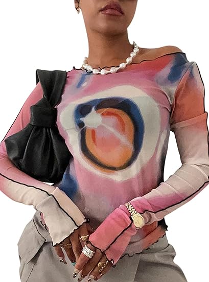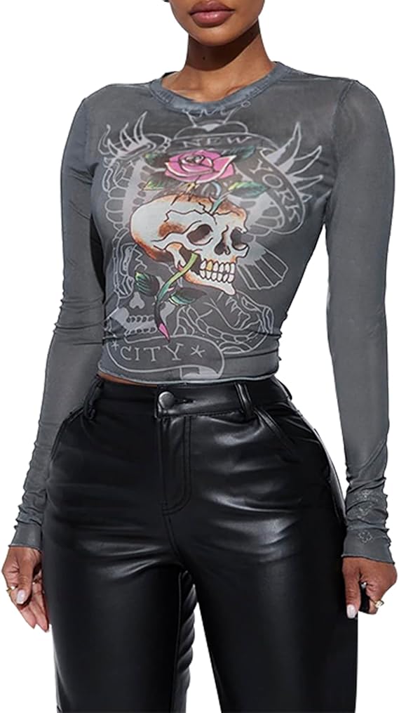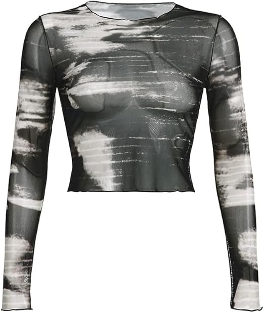 Women Sexy Graphic Crop Tops Long Sleeve See Through Cropped T Shirts Sheer Mesh Tops