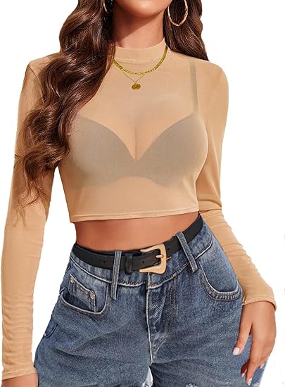 Mesh Top Mesh Crop Top for Women Y2K Long Sleeve Mock Neck Top S-XXL